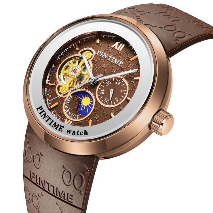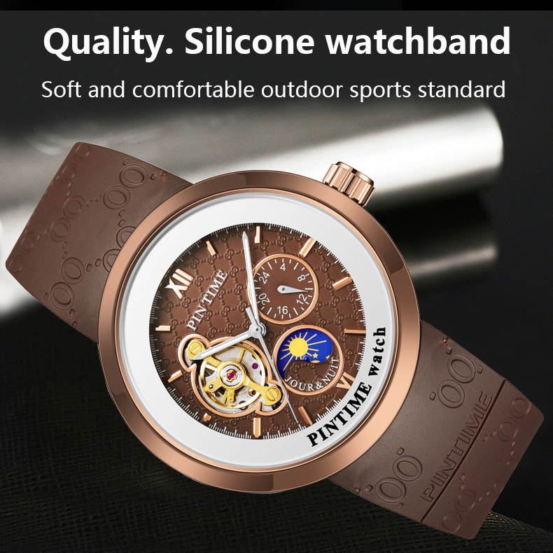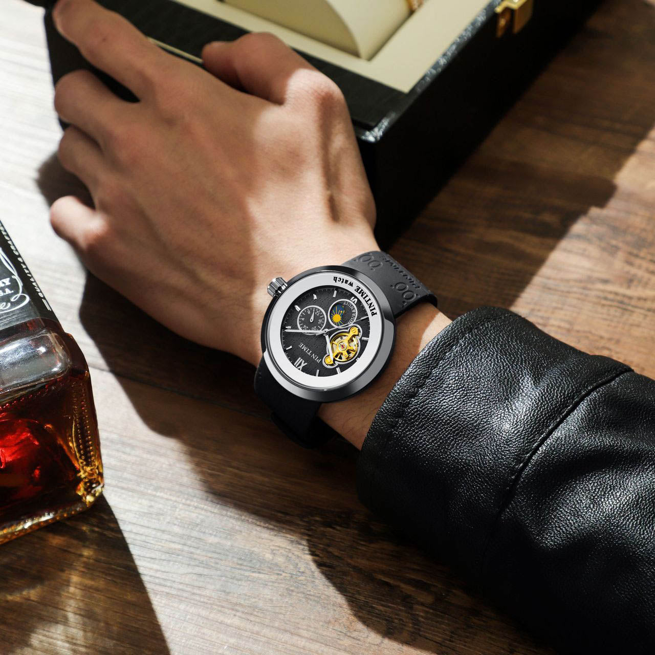 Meet FWT—a bold square mechanical that makes a statement the moment it hits your wrist. The hollow-out dial and tourbillon put the movement on show, powered forever with no battery needed. Luminous hands and mineral glass keep time clear day or night, while the rubber strap handles real-life wear. With 3ATM daily protection and a confident 50 mm profile, it’s built for impact without the luxury price. From sport to business, this piece adapts fast—and always stands out. Read More