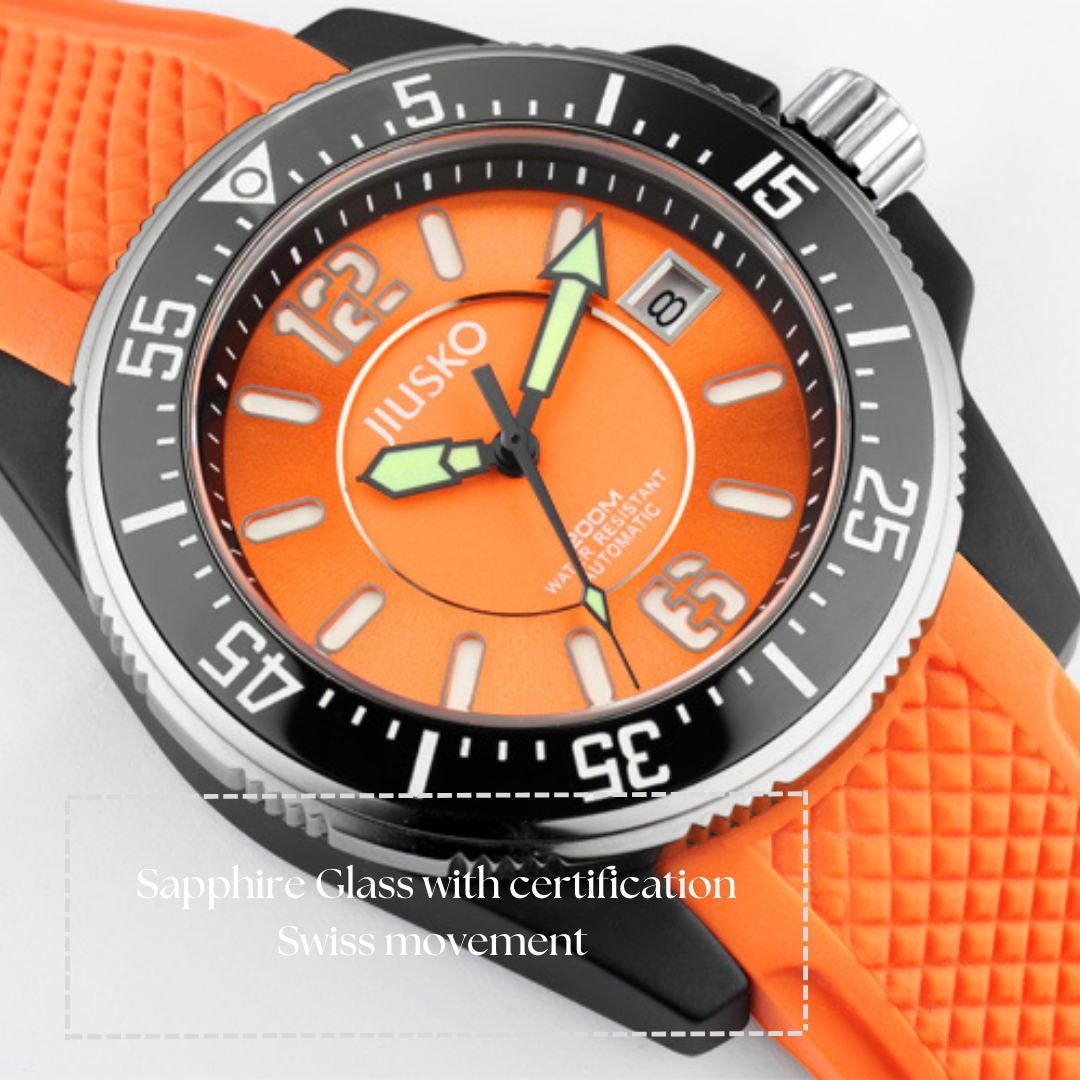 Meet FWT JDE0073L—a modern diver with everyday polish. Its SEIKO automatic movement winds from your wrist, then stores energy in a robust power-reserve system. Sapphire crystal, stainless-steel case, and bright lume keep things clear and capable day or night. A grippy silicone strap with hook buckle wears light in the water and sharp in the city. With 20 BAR (200 m) protection, this piece is ready for laps, rain, and real life. Read More